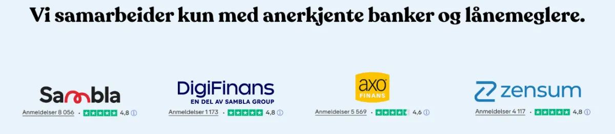 Hos Lendba jobber vi for å gi deg full oversikt over dine lånemuligheter. Vi rangerer ulike lån basert på faktorer som popularitet, lånebetingelser og vår provisjon. Vi mottar kompensasjon for å sende kunder til våre samarbeidspartnere. Du kan se hvordan vi tjener penger her. Les mer her.